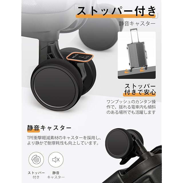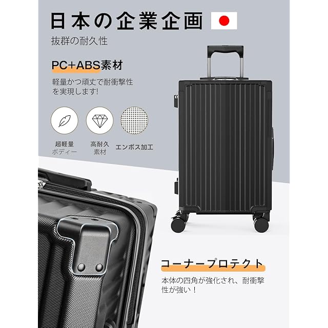 【耐久性抜群・耐衝撃コーナープロテクト】このスーツケースは、ABS 樹脂と PC(ポリカーボネート)混合素材を使用して製造されています。三層構造の素材は、重量を軽減しつつも、強力な耐久性を提供し、旅行中のさまざまな衝撃から荷物をしっかりと保護します。さらに、キャリーケースの四隅には耐衝撃コーナープロテクトが装備されており、ケース全体の耐久性を向上させ、衝撃からしっかりと守ります。