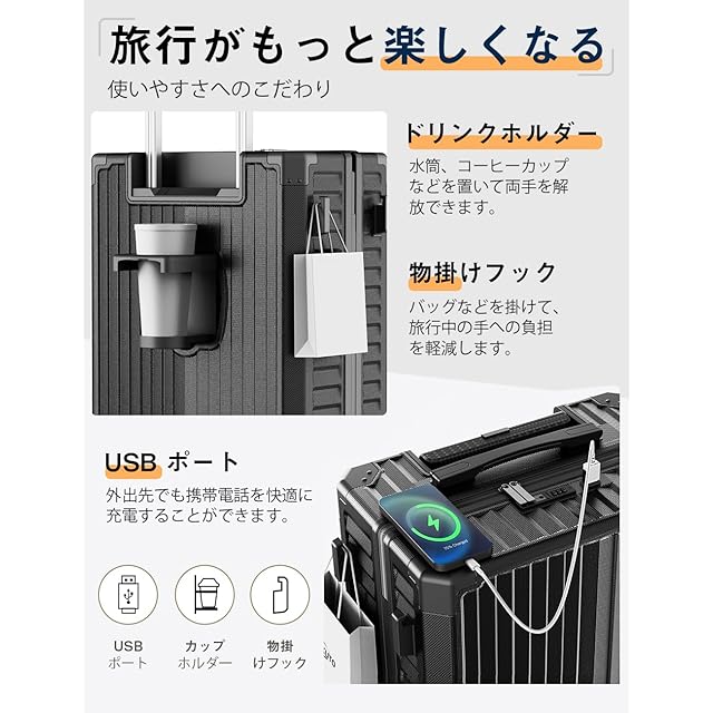 【旅行がもっと楽しくなる多機能スーツケース】便利な USB 充電ポートが搭載されており、外出先でもスマートフォンやタブレットなどの電子機器を快適に充電することができます。手元をふさがないドリンクホルダー付きは、ペットボトルなどのドリンクはもちろん、折り畳み傘も入れることができます。ワンタッチで簡単に折り畳め、使わない時も邪魔になりません。また、キャリーケースのボディ側面には手提げ袋などを掛けられるフックを搭載しています。バッグなどを掛けて、旅行中の手への負担を軽減します。