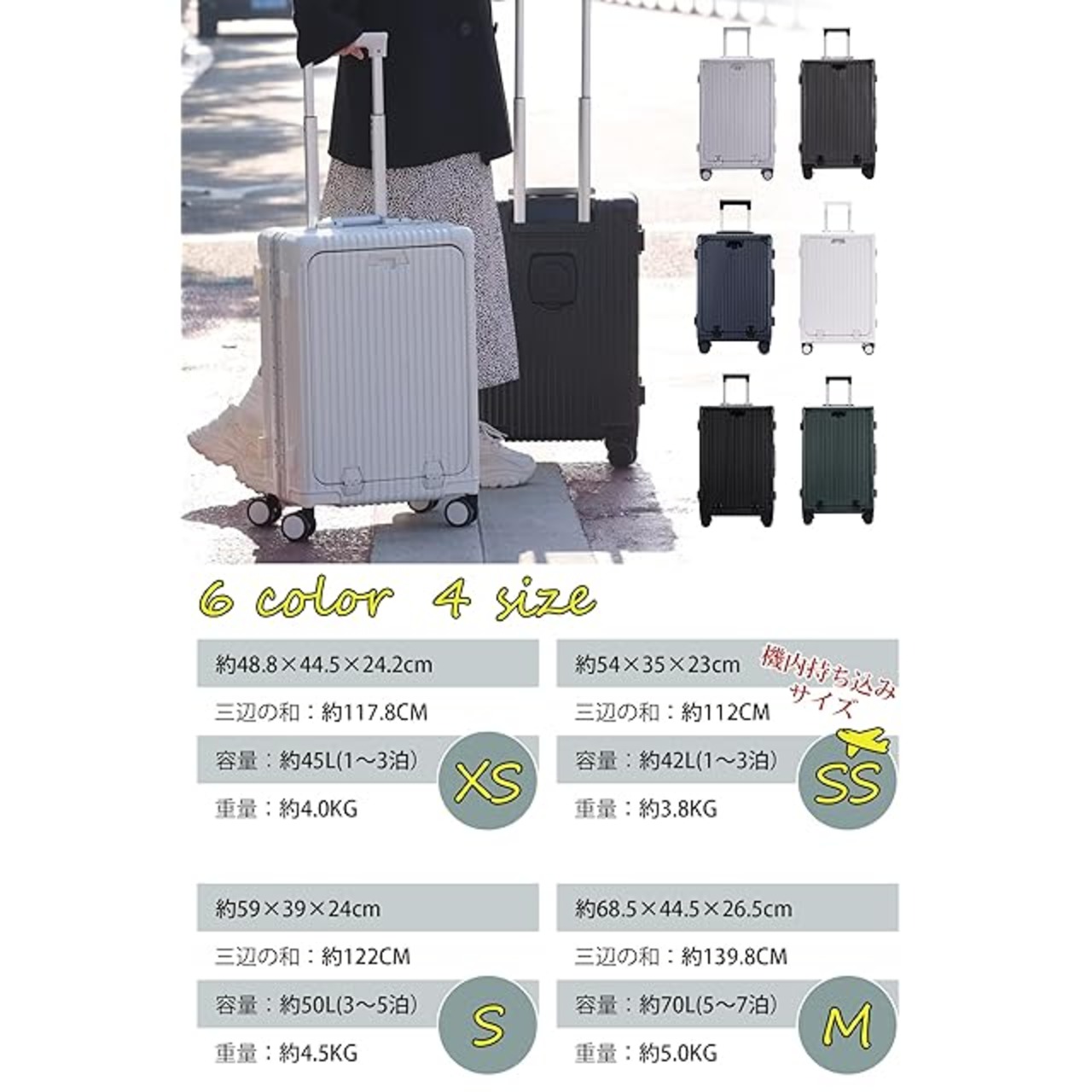 【4色、3サイズをご用意しました】お客様のご要望にお応えして、ブラック、ホワイト、グリーン、グレー、4色を用意しました。 また、3サイズがあります、XSサイズ:約高さ48.8cm、横幅44.5cm、奥行24.5cm 三辺の和117.8cm (1~3泊 約45L)、Sサイズ:約高さ59cm、横幅39cm、奥行24cm 三辺の和122cm(3~5泊 約50L)、Mサイズ:約高さ68.8cm、横幅44.5cm、奥行26.5cm 三辺の和139.8cm(5~7泊 約70L)。手作業による測定のため、サイズは1~2cmの誤差がありますので、ご了承ください。注意:航空会社によって規定が異なるため、スーツケースが機内に持ち込めるかどうかは、航空会社にご確認ください。