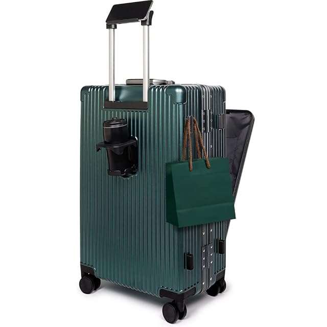 [魔法小屋] スーツケース 前開き キャスターストッパー付く キャリーケース 機内持ち込み キャリーバッグ フロントポケット スーツバッグ USB Type-C 充電口 多機能 軽音 軽量 側面フック カップボルダー 旅行出張 5-7泊(Mサイズ 67L グリーン)