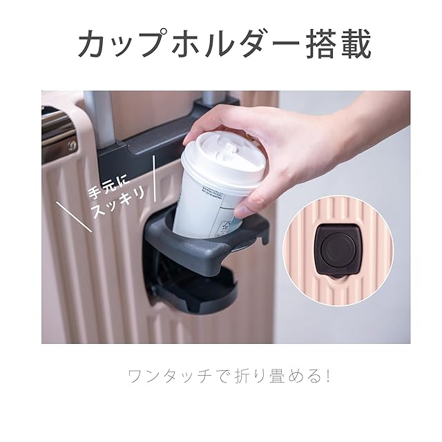 【便利なカップホルダー&隠しフック】 カップホルダーを搭載し、飲み物を手元に置いたまま移動可能。折りたたみ式で、使わないときはスッキリ収納できます。また、サイドには隠しフックが付いており、バッグなどを掛けられるため、荷物が増えても両手を自由に使えます。