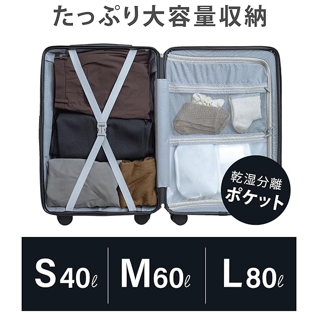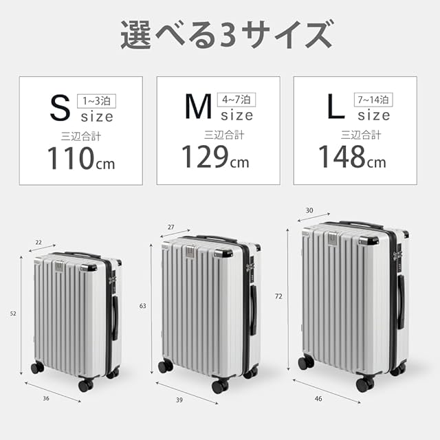 【安心のカスタマーサポート】 本製品に関するご質問や不明点があれば、カスタマーサポートまでお気軽にお問い合わせください。 サイズ展開 Sサイズ:容量40L、機内持ち込み可能(22×36×52cm)。1~3泊程度の旅行や短期出張に最適。 ※機内持ち込みは各航空会社・空港の規定により異なる場合があります。事前にご確認ください。 Mサイズ:容量60L(27×39×63cm)。4~7泊程度の旅行におすすめ。 Lサイズ:容量80L(30×46×72cm)。7~14泊程度の長期旅行や出張に対応。