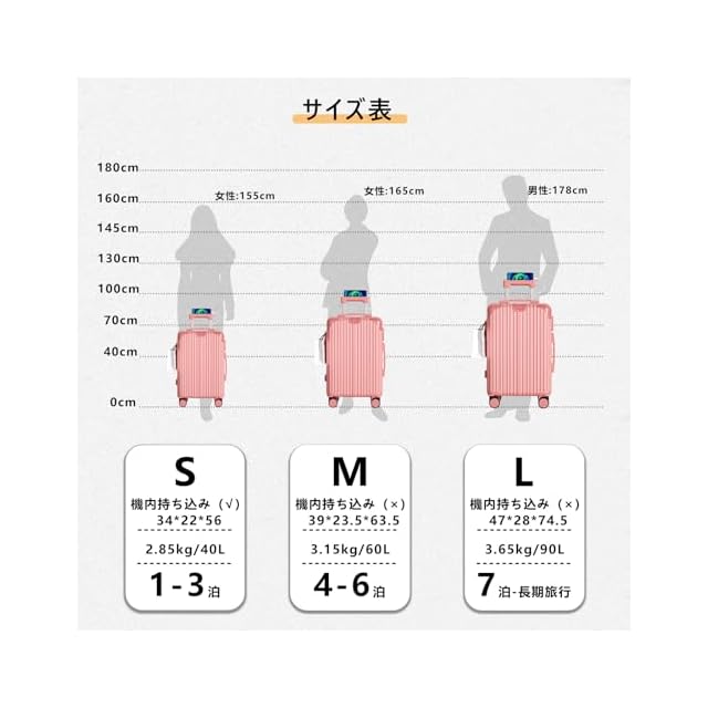 【サイズ情報】Sサイズ:34×22×56 cm、三辺合計:112 cm、機内持ち込み可。容量:40 L、宿泊基準:1-3泊。Mサイズ:39×23.5×63.5 cm。容量:60 L、宿泊基準:4 ~ 6泊。Lサイズ:47×28×74.5 cm。容量:90 L、宿泊基準:7泊~長期旅行。※商品の外寸は、トップとサイドハンドル、サイド固定脚、キャスターのマークを取る。寸法測定には若干の誤差がありますのでご了承ください。