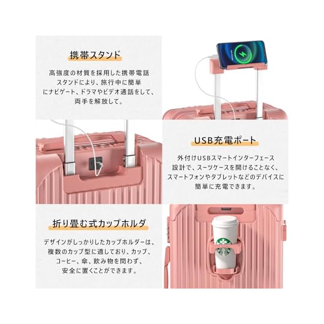 【USBポート+飲料スタンド+携帯スタンド多機能キャリーケース】①USB充電ポートを備え、いつでも電子機器を充電できる。②スーツケースの背面には折りたたみ可能なカップホルダーが設置されており、飲み物、ボトル、カップ、傘などを簡単に取り出して入れることができます。③スーツケースのハンドルにはスマホスタンドが付いており、動画やビデオ通話を見たり、両手を解放したりするのに便利です。