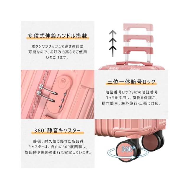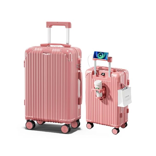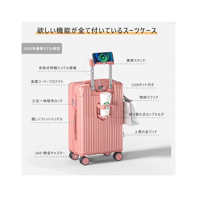 [SupTrip] スーツケース 機内持ち込み キャリーケース USBポート付き キャリーバッグ カップホルダー付き 隠しフック機能 多機能 大型 超軽量 静音 ダブルキャスター 耐衝撃 360度回転 軽量 ビジネス 修学 泊まる 旅行 出張 (ピンク, Sサイズ/機内持込(1-3泊))