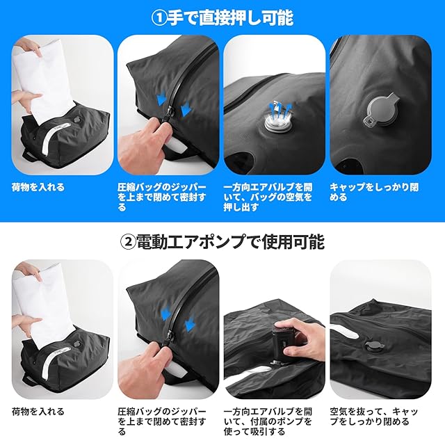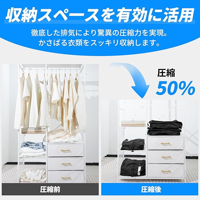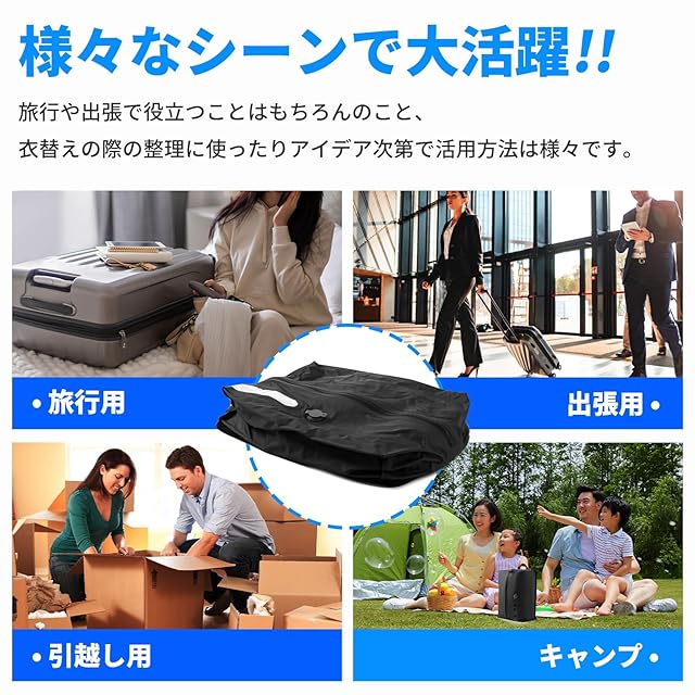 【約50%のスペースを確保する高圧縮】各セットの収納袋には携帯用の電動空気抜きポンプが付属しており、衣類を収納バッグに入れ、ジッパーを閉じて、空気抜きポンプで空気を簡単に抜くだけで、衣類の体積に体積を圧縮します。ユニークな圧縮デザインが特徴で、荷物スペースを最大化します。旅行や出張時のかさばる衣類もスッキリ収納します。