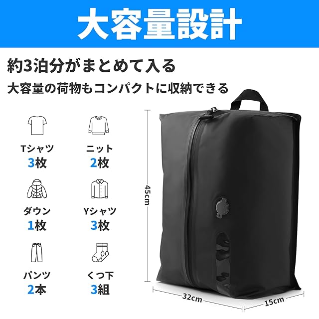 【大容量設計】約3泊分の荷物でもコンパクトに収納できます。Tシャツやセーター、ダウンジャケット、靴下、パンツなどをまとめて圧縮できます。ユニークな圧縮デザインが特徴で、衣類の体積を効果的に縮小し、荷物スペースを最大化します。濡れた荷物も入れられるので、スーツケースやバッグの中を濡らしません。