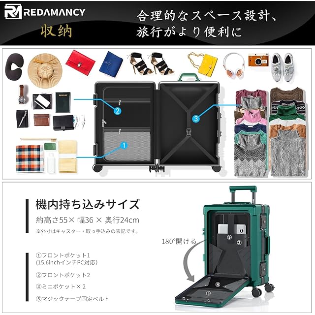 [Redamancy] スーツケース 機内持ち込み フロントオープン USB充電ポート付き ノートPC収納ポケット 多機能 キャリーケース アルミフレーム TSAロック搭載 ストッパー付き 360°静音ブレーキホイール 包角保護 フロントオープン 荷物フック 超軽量 耐衝撃 頑丈タイヤ 海外旅行出張(1-3泊 20インチ 42L あんりょくしょく)