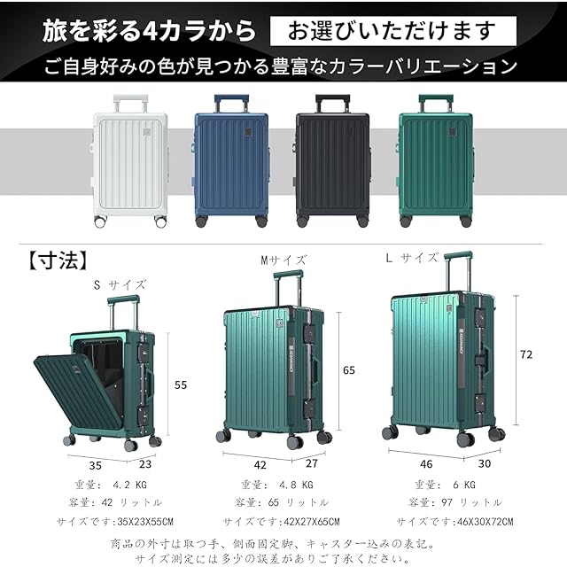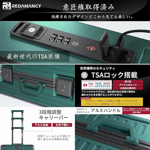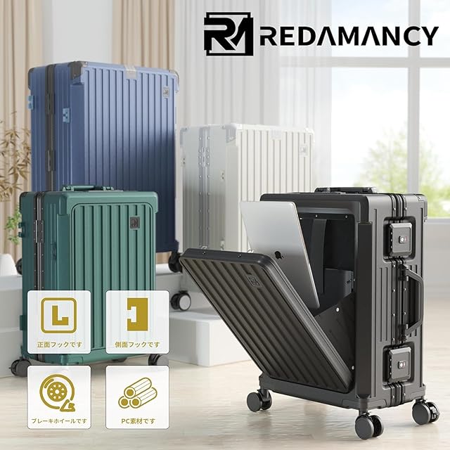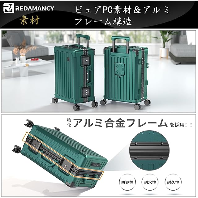 【軽量で耐久性のPC素材 & 包角保護 & アルミフレーム】高品質ポリカーボネート(PC)素材:軽量でありながら非常に丈夫な構造を実現。衝撃に強く、長期的な使用でも変形しにくいので、安心してお使いいただけます。包角保護:には強化された包角保護が施されているため、落下時の衝撃からスーツケースを守り、外観も美しく保てます。アルミニウムフレーム:アルミニウム製のフレームを採用し、全体的な強度を向上させ、耐久性を高めています。この特徴の組み合わせにより、このスーツケースは市場平均より30%耐久性が高くなっている!Redamancyは、お客様の満足度を最優先に考え、最高品質の製品をお届けします。万が一問題があった場合は、迅速に対応いたします。