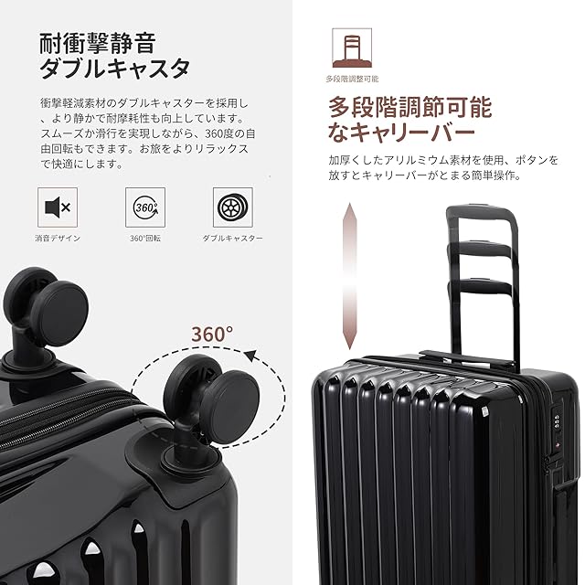 【PC(ポリカーボネート)とABS樹脂素材使用】PC樹脂の強度とABSの耐衝撃性を兼ね備えています。軽量、丈夫な素材で、素材とカラーリングの美しさが際立つ鏡面加工。男性だけなく女性の簡単に持ち上げるの軽量なキャリーケースです。ブラック スーツケースは マットな仕上がり。
