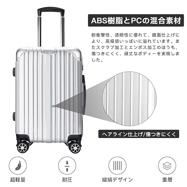 【表面素材】スーツケースはABS樹脂とPCでの混合素材で作られ、耐衝撃性に優れています。エンボス加工、傷つきにくい。縦縞デザインにより、シンプルかつファッションです。超軽量で、女性でも楽々に持ち出かける人気なキャリーケースです。便利な鍵式へグレードアップ。TSAロックが搭載され、鍵が2本付属しており、面倒なダイヤル設定が不要。