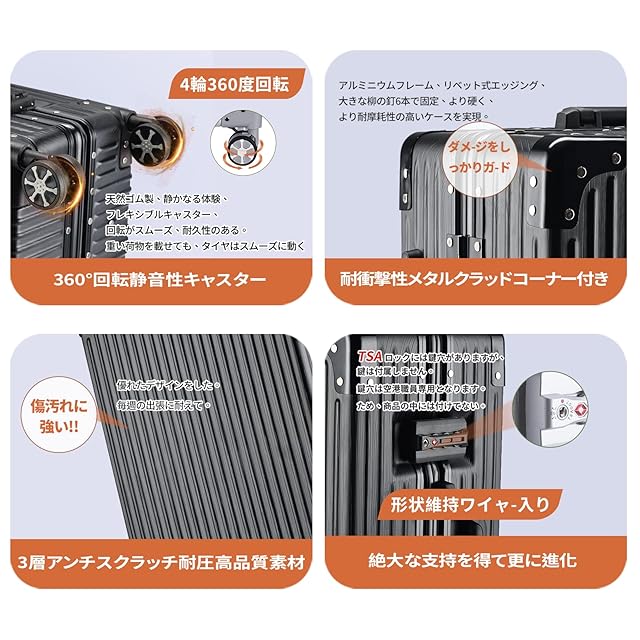 【素材】1,表面素材には三層構造のPCポリカーボネート樹脂+ABS素材を採用しており、軽量なのに耐衝撃性に優れています。人気のアルミフレームを採用しており、ビジネスでもカジュアルでもシーンを選ばずに使用できます。スタイリッシュでありながら、と国内旅行や出張には十分な大きさです。 2,フレーム:アルミ。軽量で持ち運びやすいです。女性でも男性でも持てるカラーとデザイン。