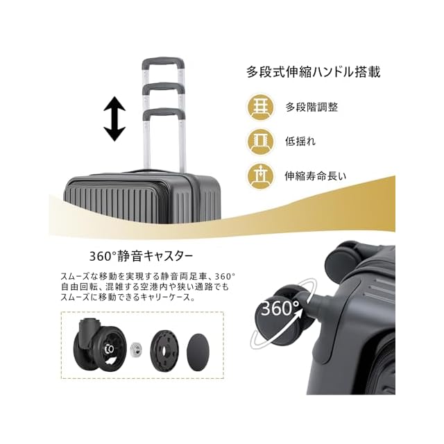 【双輪キャスター・360度回転】静音、耐久性に優れた双輪キャスターは、自由に360度回転し、旋回時や悪路の走行も安定しています。故障率の高いシングルタイヤに比べて、安定感抜群です。高弾性TPE衝撃軽減素材のキャスターを採用し、より静かで耐摩耗性も向上しています。スムーズな滑りを実現しながら、360度の自由回転もできます。ダブルキャスターデザイン、旅先での移動をよりリラックスで快適になります