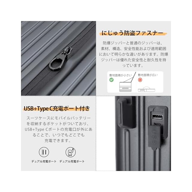【高品質なボディ&丈夫かつ軽い素材】軽さと堅固性に優れているPC (ポリカーボネート)とABS樹脂を配合したボディ。女性でも持ち上げられる軽さですが、衝撃に強く中の荷物をしっかりと守ります。 衝撃にも強く、無数に細かい凸凹が傷をつきにくくしてくれます。ケースのメンテナンスに関するヒント: 傷やへこみを避けるため、鋭利なものでスーツケースを傷つけたり、激しい摩擦や衝突を与えたりしないように注意してください。