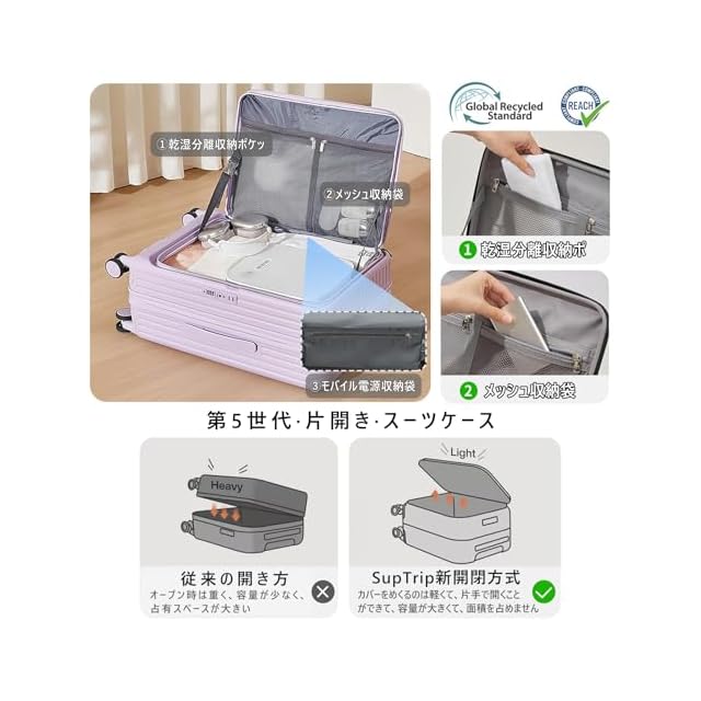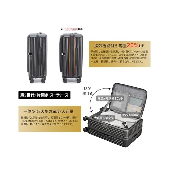 【第5世代·片開き·スーツケース】片面開きなので、狭い場所でも完全に開かずに荷物を出し入れでき、占有スペースが50%削減され、片手でも簡単に開くことができます。ファスナーを1周ひねるだけで容量が20%アップし、より多くの収納スペースを提供します。旅先での買い物など荷物が増えても安心ですし、急に増えた荷物にも気軽に対応できます。注意:拡張後は機内に持ち込めません。