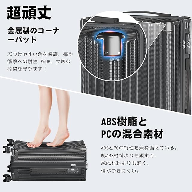 【軽量で頑丈なABS+PCボディ】 本体は軽量性と耐衝撃性に優れたABS樹脂とPCの複合素材を採用。女性でも楽に持ち上げられる重さです。表面に施された無数の微細な凹凸模様が傷つきを防止し、さらに四隅にアルミニウム合金製メタルガードを4ヶ所配置。耐衝撃性能を向上させることで、スーツケースの耐久性をさらに高めています。