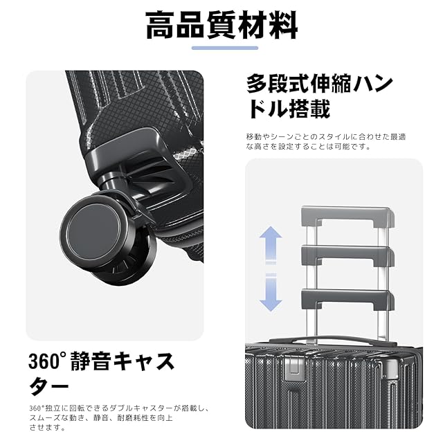 【360°静音キャスター・快適な弾性ハンドル】360°独立に回転できるダブルキャスターが搭載し、スムーズな動き、静音、耐磨耗性を向上させます。また、スーツケースにはシリコンソフトハンドルが2つ付属しています,人間工学に基づいた設計、柔らかくて握りやさしい、長時間持っても疲れにくい。
