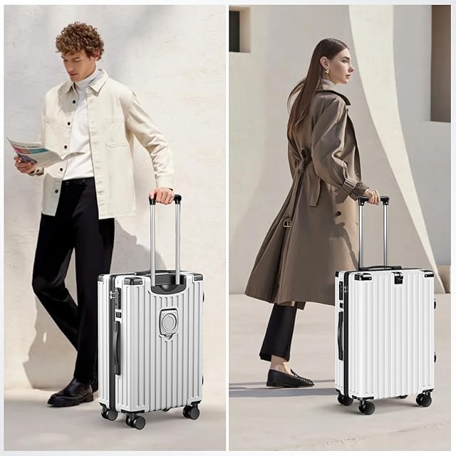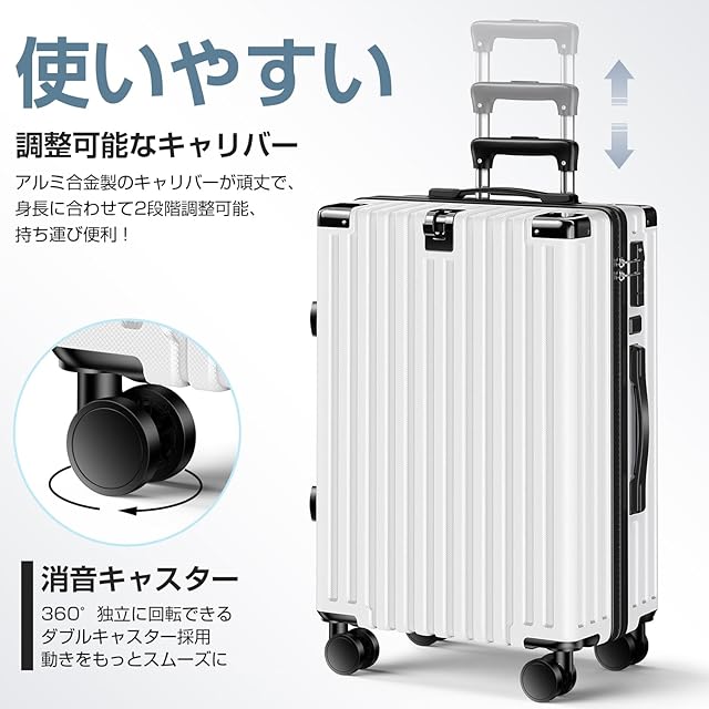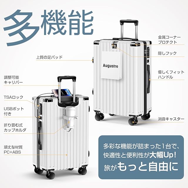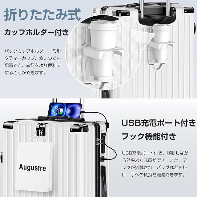 [Augustre] スーツケース 機内持ち込み 超軽量 キャリーケース 大型 軽量 多機能 キャリーバッグ 静音 耐衝撃 ダブルキャスター S/M/Lサイズ カップホルダー付 USB充電機能 隠しフック機能 360度回転 TSAローク搭載 ファスナー式 旅行 ビジネス 出張 (ホワイト, L(7泊~長期旅行/95L))
