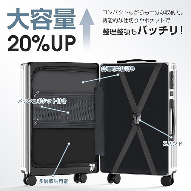 【市場最軽量・超大容量】市場最軽量仕様として、一般的なスーツケースより、平均1kg重さが遠います。長時間スーツケースをもって移動する場合や頻繫に出張、旅行の方におすすめです。Sサイズ、機内持ち込みにも最適です。さらに、メッシュポケット内蔵され合計4箇所メイン収納があります。大容量収納×合理的なデザイン、コンパクトながらも十分な収納力があります!機能的な仕切りやポケットで整理整頓もバッチリ!大容量なスーツケースは収納便利、旅行や故郷帰りなど最適なスーツケースです。