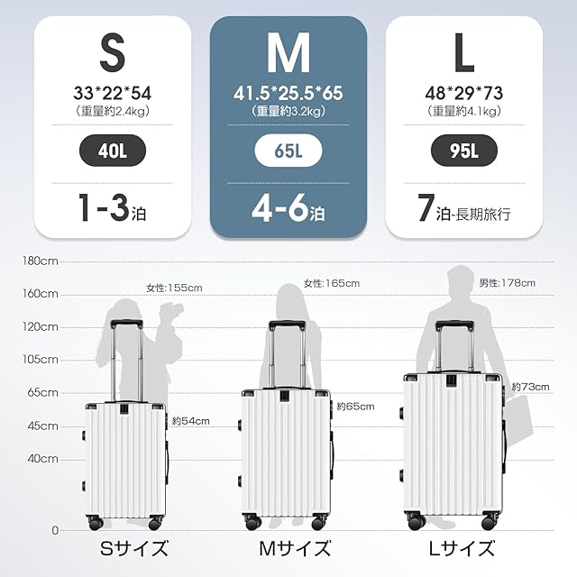 【5カラー・3サイズ展開】用途やスタイルに合わせて選べる多機能スーツケース 。S・M・Lの3サイズはそれぞれ日帰りから長期旅行まで幅広く対応し、男女兼用のデザインでビジネスにも観光にも最適。豊富なカラーバリエーションと洗練された外観で、スーツケース としての使いやすさも抜群。機能性とデザイン性を兼ね備えた理想的なキャリーバッグ・キャリーケースです。