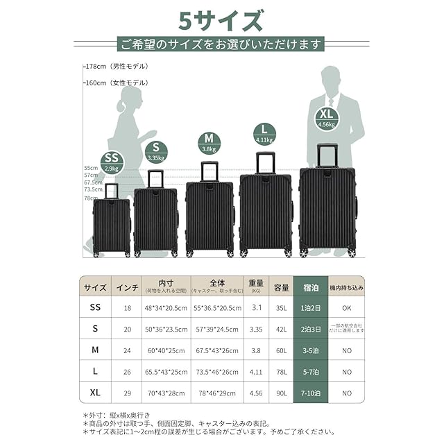 【軽量で、大容量】人気のアルミフレームを採用しており、ビジネスでもカジュアルでもシーンを選ばずに使用できます。本体は耐久性に優れたABS樹脂とPC製で、密閉度の高いアルミフレームにより、ファスナーレスとなっております。【注意】フレームの材質だけがアルミニウムです。スタイリッシュでありながら、5サイズの重量はわずか3~5KG、それでいて容量は35ℓ~90ℓと国内旅行や小旅行には十分な大きさです。