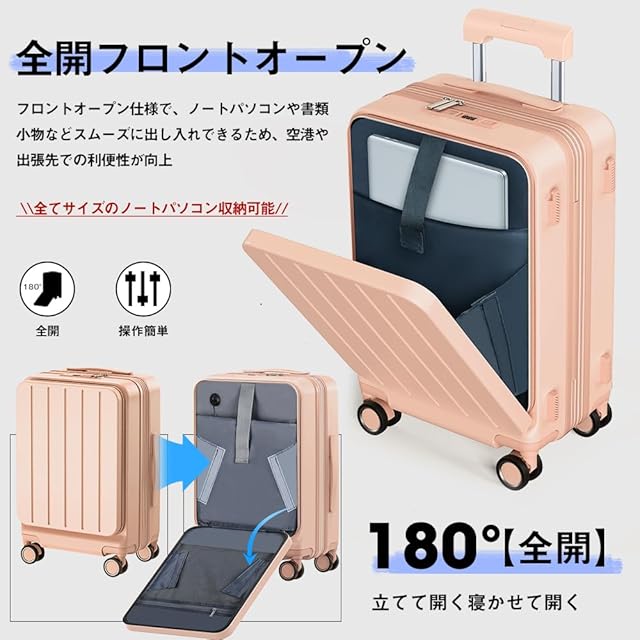 ✅【スーツケース フロントオープン構造|機内や移動中でも出し入れスムーズ】 ノートPCやタブレット、小物類を素早く取り出せるスーツケース フロントオープン設計。特に出張や空港でのセキュリティチェック時に便利です。Sサイズのスーツケース 拡張機能付きは、拡張せずに使えば機内持ち込み可能なため、国内外問わず移動時に役立ちます。スマートで機能的なキャリーケースをお探しの方におすすめです。