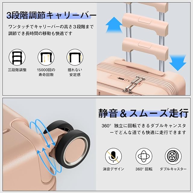 ✅【静音ダブルキャスター・超軽量設計|スムーズな操作性】 360度回転する静音ダブルキャスターと軽量設計で、移動時のストレスを大幅に軽減。人混みの中や段差のある場所でもスムーズな走行が可能です。スーツケース 拡張機能付きでありながら、持ち運びやすさを重視。スーツケース フロントオープンタイプで、機能と操作性を両立させた優秀なキャリーバッグ・キャリーケースです。