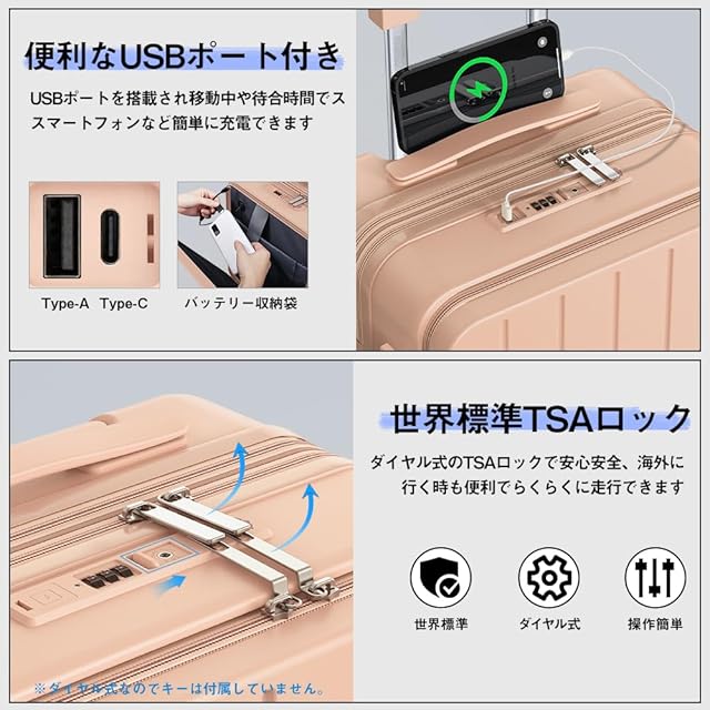 ✅【USBポート・カップホルダー・隠しフック搭載|利便性に優れたスーツケース】 スマホ充電ができるUSBポート、カップホルダー、荷物を吊るせる隠しフックなど、出先での快適性を追求した多機能設計のスーツケース 拡張機能付き。スーツケース フロントオープンだから取り出しも簡単で、時間が限られた移動中にも便利。旅行・ビジネスどちらにも活躍する、洗練されたキャリーバッグ・キャリーケースです。