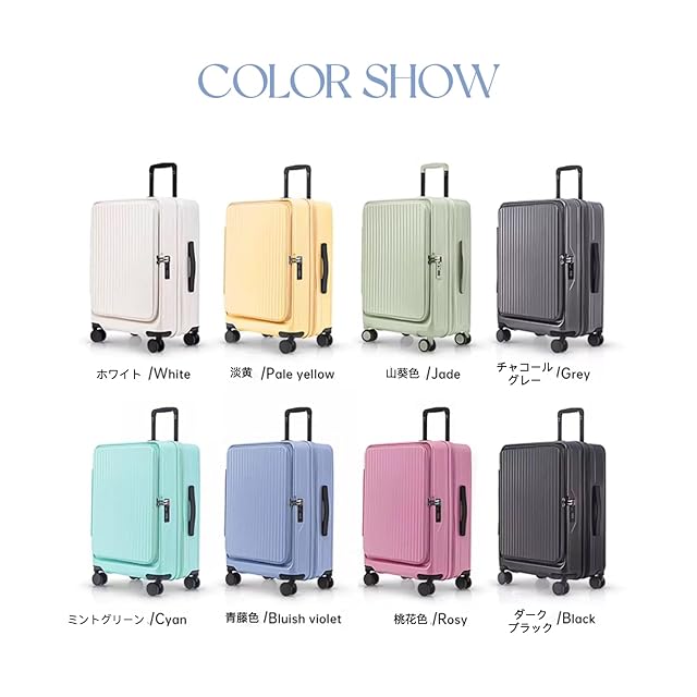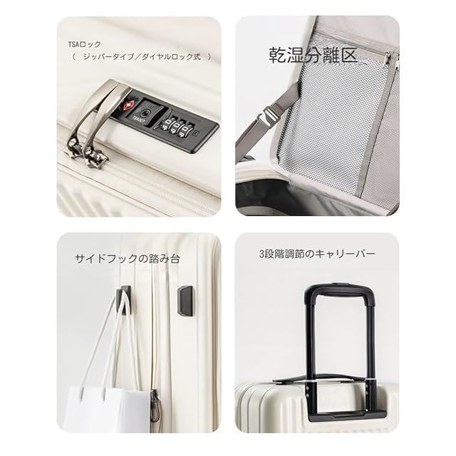 【新発売!便利な片開き+フロントオープン】片面開きなので狭い場所でも完全に開けずに出し入れが可能で、占有スペースを50%削減します。大容量の収納スペースが1つあり、荷物を順番にポンポンと入れるだけで簡単です。扉の内側には取り出しやすいものを入れられるマチ付きのメッシュポケットがあり、ガジェットの収納に便利です。中仕切りには濡れたものを収納できるポケットも付いているため、傘などの濡れたものを収納しても心配ありません。ご注意:Sのロックはス一ツケ一スの上に取り付けて、MとLのは側面に取り付けています。