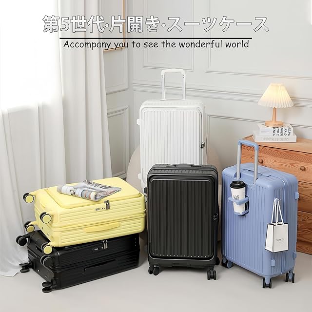【第5世代·片開き·スーツケース】片面開きなので、狭い場所でも完全に開かずに荷物を出し入れでき、占有スペースが50%削減され、片手でも簡単に開くことができます。ファスナーを1周ひねるだけで容量が20%アップし、より多くの収納スペースを提供します。旅先での買い物など荷物が増えても安心ですし、急に増えた荷物にも気軽に対応できます。注意:拡張後は機内に持ち込めません。