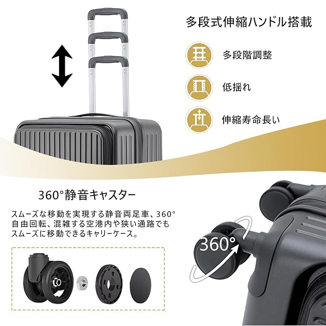 【双輪キャスター・360度回転】静音、耐久性に優れた双輪キャスターは、自由に360度回転し、旋回時や悪路の走行も安定しています。故障率の高いシングルタイヤに比べて、安定感抜群です。高弾性TPE衝撃軽減素材のキャスターを採用し、より静かで耐摩耗性も向上しています。スムーズな滑りを実現しながら、360度の自由回転もできます。ダブルキャスターデザイン、旅先での移動をよりリラックスで快適になります