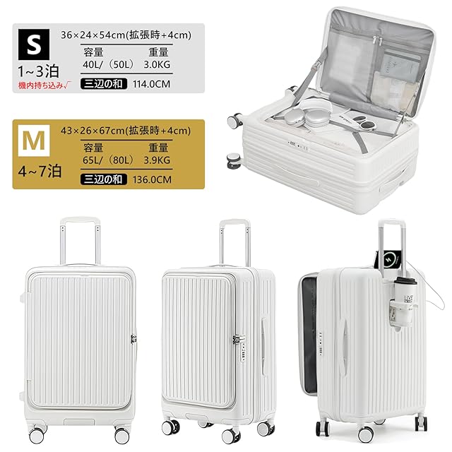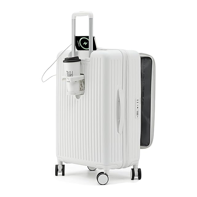[SupTrip] スーツケース キャリーケース 多機能 片開き 拡張機能付き 機内持ち込み キャリーバッグ フロントオープン USBポート付き カップホルダー付き 隠しフック機能 超軽量 耐衝撃 静音 360度回転 大容量 TSAロック搭載 旅行 ビジネス 出張 (ホワイト, S(1~3泊/40L/機内持込))