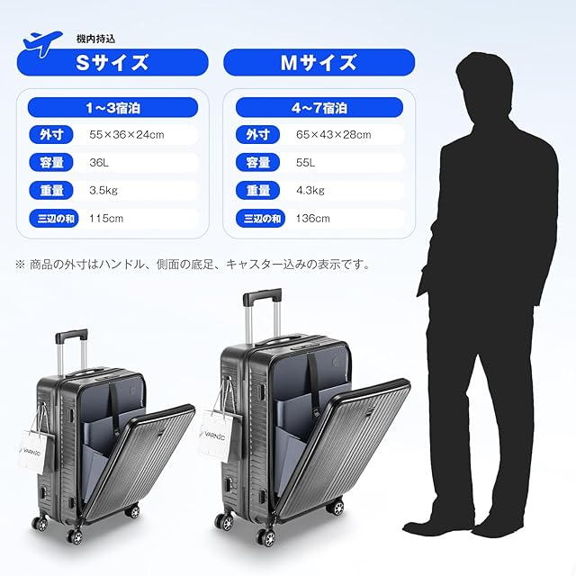 【高品質素材採用】フロントオープン スーツケースはABS樹脂とPC混合素材を採用されており、軽量で耐圧性、耐久性に優れ、大切なお荷物をしっかりと守ってくれます。三段階調節なアルミ合金制キャリーバーはスムーズに伸縮でき、さまざまな体格の方に合わせて調整可能です。長旅や出張にも最適です。