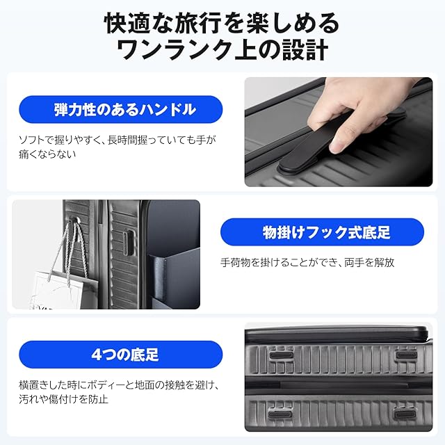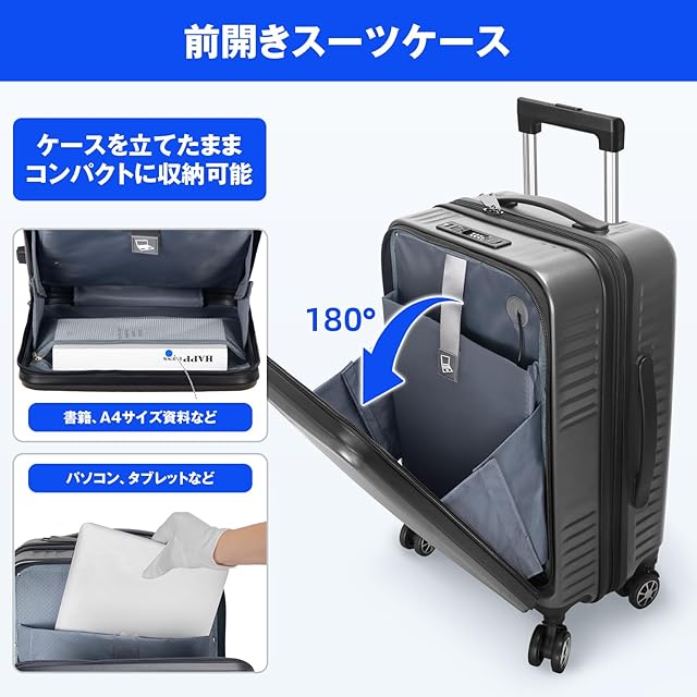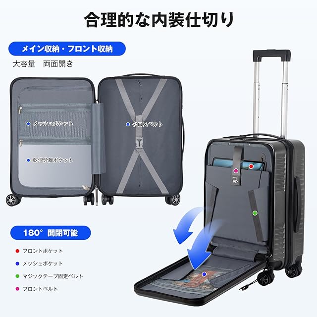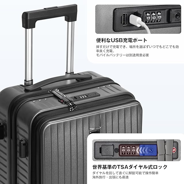 【便利なフロントオープン設計】スーツケースは便利なフロントオープンポケットを搭載し、パソコンやタブレット、パスポートなどの荷物を立てたまま簡単に取り出すことができます。便利なUSB充電ポート付きで、場所を選ばずいつでもどこでも移動しながら効率よく充電ができ、より快適な旅行を楽しめます。