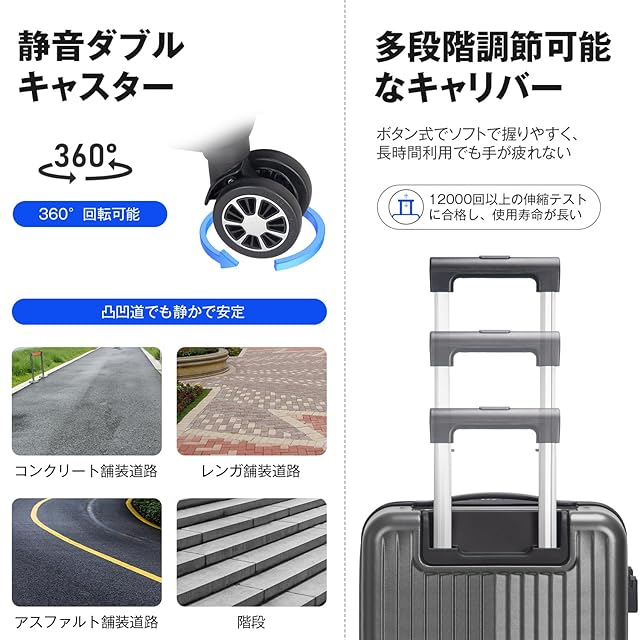 【多機能で実用的なキャリーケース】360°自由に回転可能な静音キャスターは静かで耐摩耗性を大幅に向上し、デコボコ道でもスムーズな滑りを実現します。世界基準のTSAダイヤル式ロック付きでセキュリティも万全。※鍵穴が航空会社の検査専用の物で本製品は鍵が付属しておりません。物掛けフック式底足付きで手荷物を掛けて気楽に移動でき、旅行中の手への負担を軽減します。