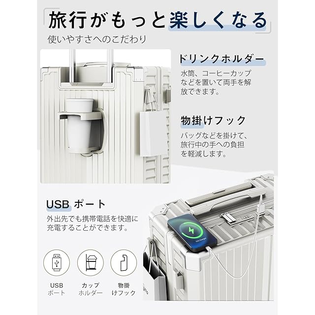 【旅行がもっと楽しくなる多機能スーツケース】便利な USB 充電ポートが搭載されており、外出先でもスマートフォンやタブレットなどの電子機器を快適に充電することができます。手元をふさがないドリンクホルダー付きは、ペットボトルなどのドリンクはもちろん、折り畳み傘も入れることができます。ワンタッチで簡単に折り畳め、使わない時も邪魔になりません。また、キャリーケースのボディ側面には手提げ袋などを掛けられるフックを搭載しています。バッグなどを掛けて、旅行中の手への負担を軽減します。