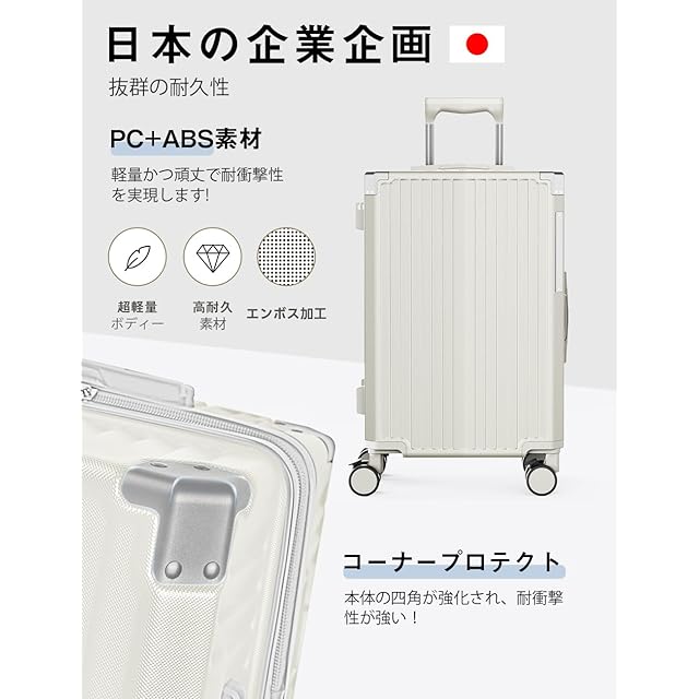 【耐久性抜群・耐衝撃コーナープロテクト】このスーツケースは、ABS 樹脂と PC(ポリカーボネート)混合素材を使用して製造されています。三層構造の素材は、重量を軽減しつつも、強力な耐久性を提供し、旅行中のさまざまな衝撃から荷物をしっかりと保護します。さらに、キャリーケースの四隅には耐衝撃コーナープロテクトが装備されており、ケース全体の耐久性を向上させ、衝撃からしっかりと守ります。