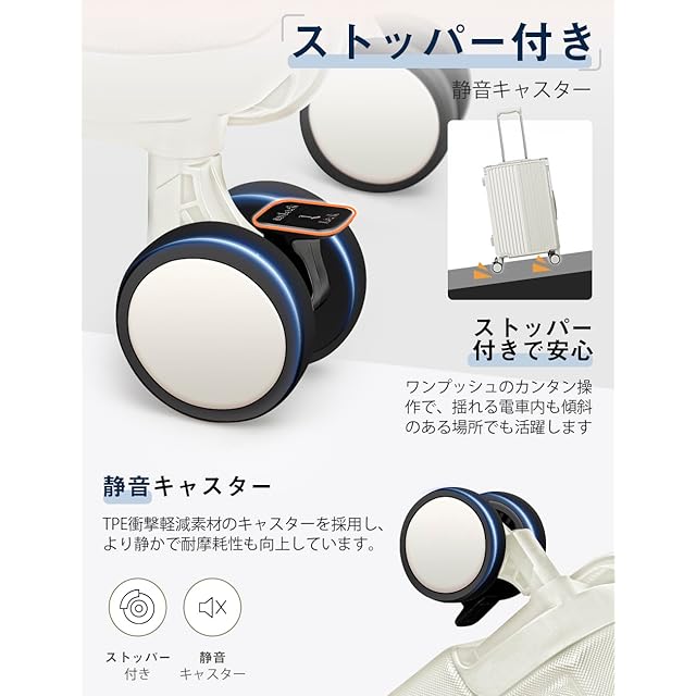 【ストッパー付き静音キャスター・合理的な仕切りデザイン】スーツケースには自走を抑えるキャスターロックが搭載されており、電車などの揺れで不意の動きを防ぎ、安定した移動をサポートします。耐摩耗性に優れた TPE 素材を使用しており、ノイズや振動を低減し、より安定したスムーズな操作が可能です。キャリーケースには密閉された U 字型コンパートメントがあり、荷物を入れてもばらばらになりません。メッシュ状のポケット付きで、入れた物が一目でわかります。X 型ベルトが搭載されており、荷物の崩れを防止し、移動中でも安心して使用できます。