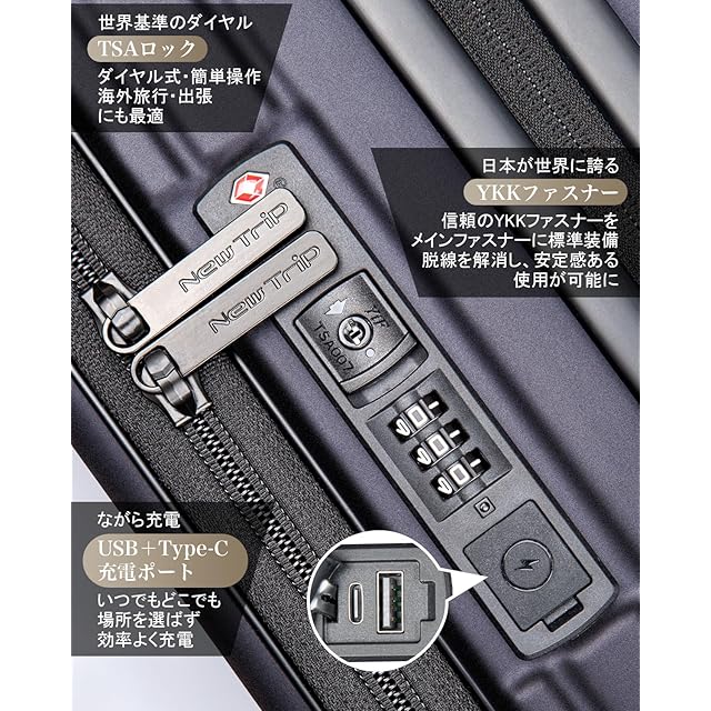 【高品質のPC100%ボディ&信頼のYKKファスナー】スーツケースのボディには、軽さと耐衝撃性に優れたPC(ポリカーボネート)100%を採用。旅行中の衝撃にも強く、大切な荷物を守ります。また、日本が世界に誇るYKKファスナーを搭載し、一般的なファスナータイプのスーツケースによくあるファスナーの不具合(ファスナー脱線や開き)を解消し、長期にわたって安心してご使用いただけます。