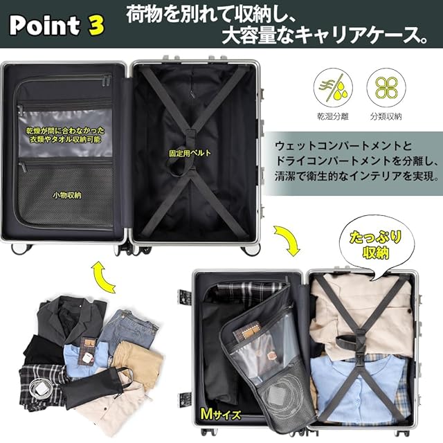 「世界標準のTSAロックを採用したスーツケース」弊社のスーツケースには世界標準のTSAロックが装着されており、ロックしたまま荷物を預けることができ、税関を早めに通ります。注意事項:鍵穴は税関検査用のみのため、鍵は含まれていません。キャリアバッグ内部の右に乾湿分離のデザインなので、旅行時、使用したおしぼりや汚れた服などは他の生活用品と分けて収納でき、より清潔で衛生的です。