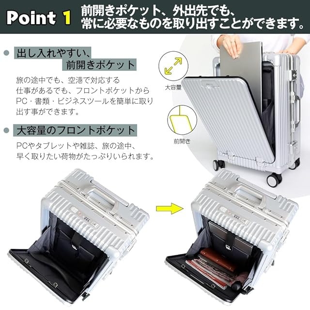 【新型前開きスーツケース登場、充電ポートも付いている、便利性が高め!】スーツケースにて画期的なデザイン、前ポッケトスーツケースが誕生。読みたい雑誌でも、仕事で必要なパソコンでも、早く手に取りたいものがたっぷり入られます。更に、スーツケースにて2種類充電ポートが(USB+Type-C)搭載しており、各機種に対応でき、旅先に充電切れの心配がありません!モバイルバッテリーを出し必要もありません、歩いながらスマホを充電することができます。*注意:スーツケースにモバイルバッテリーが用意しておりません。ご自分で用意します。