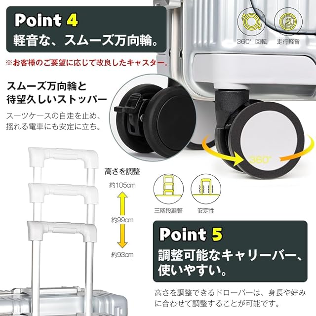 「多段調節可能レバーと輪待望久しいストッパー」お客様のご要望に応じてキャスターを改良しました、皆様待望久しいストッパーを付いていました!なお、スーツケースは360度自由回転の静音万向輪を使って、口径を大きくしてキャスターの静音性、安定性、耐久性を向上させました。デコボコの道路も斜面も滑らかに走ることができます。軽量かつ頑丈なアルミ製のラバーは、多段調節可能のデザイン、様々な身長の人に合っていて、男女問わず利用できます。