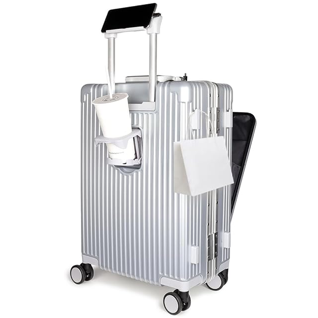 「USB+Type C充電ポート、カップホルダーとスマホルダーを付く、前開きキャリアバッグ」パソコンが出し入れやすいように、スーツケースには前開きポケットがあり、空港や職場でPCを素早く取り出せるようになっています。カップを置きるため、キャリアバッグの後部に折りたたみ式のカップホルダーを設けています。スーツケースには高さ調節可能なレバーがあり、レバーの上部にはスマホルダーが付いているので、フライトの待ち時間に両手が自由になり、外出先でもリラックスできます。さらに、スーツケースにはUSB+Type-Cデュアル充電ポート、3種類の充電ケーブルを内蔵しています。各機種に対応したデュアル充電ポート、モバイルバッテリーポーチを用意しました。