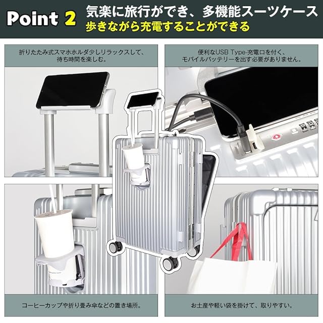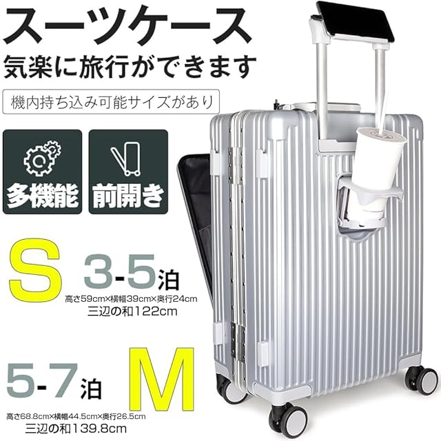 【多機能スーツケース、旅を楽しむ!】お客様のご要望に応じてキャスターを改良しました、皆様待望久しいストッパーを付いていました!スーツケースの自走を止め、摇れる 電車にも安定に立ち。スーツケースはカップホルダーを付く、カップだけなく、折りたたみ傘やコーヒーカップも置きます。キャリバー上部にはスマホホルダーが付いているので、フライトの待ち時間を楽しむ、外出先でもリラックスできます。スーツケース(SサイズとMサイズ)の側面にはフックが付いています、旅先のお土産が掛け、両手を解放します。