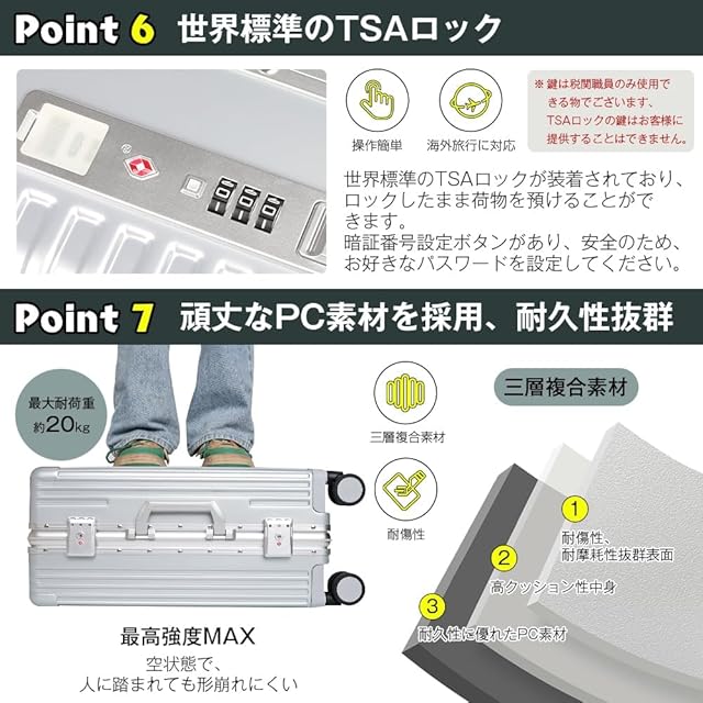「耐久性抜群、頑丈なPC素材を採用したスーツケース」:弊社のキャリアケースは、軟鋼板と呼ばれるPC素材を使用しています。PC素材の耐圧縮性、弾力性に優れており、スーツケースは高いところから落ちるても、重いもので押せられても、元の状態を維持することができます。さらに、スーツケースのランクは、より耐久性と安全性の高いアルミフレームが採用されています。スーツケースは3層の複合材で構成されており、強度をより高めています、スーツケースの中の大切な荷物を保護し、長期間使用できるようにします。 また、キャリアケースの表面は丁寧に塗装され、高級感のある光沢に仕上がっています。