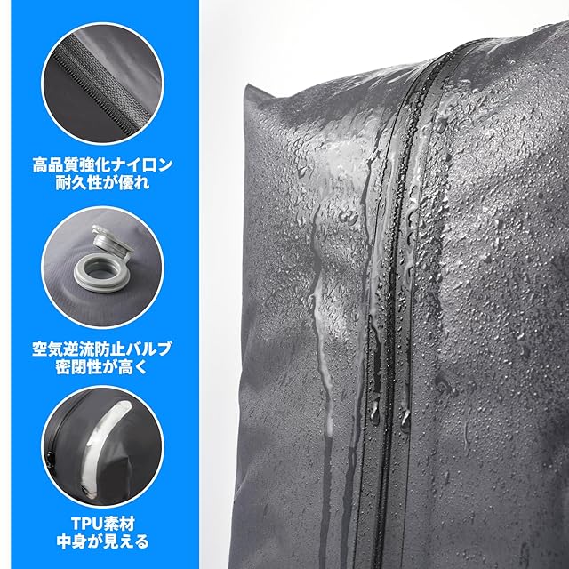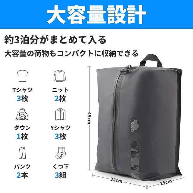 【大容量設計】約3泊分の荷物でもコンパクトに収納できます。Tシャツやセーター、ダウンジャケット、靴下、パンツなどをまとめて圧縮できます。ユニークな圧縮デザインが特徴で、衣類の体積を効果的に縮小し、荷物スペースを最大化します。濡れた荷物も入れられるので、スーツケースやバッグの中を濡らしません。