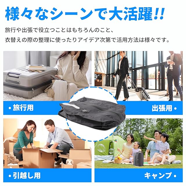 【約50%のスペースを確保する高圧縮】各セットの収納袋には携帯用の電動空気抜きポンプが付属しており、衣類を収納バッグに入れ、ジッパーを閉じて、空気抜きポンプで空気を簡単に抜くだけで、衣類の体積に体積を圧縮します。ユニークな圧縮デザインが特徴で、荷物スペースを最大化します。旅行や出張時のかさばる衣類もスッキリ収納します。