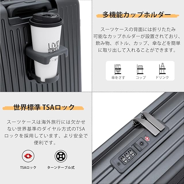 【多機能・USB+Type C充電ポート付き ・カップホルダーとスマホルダーを付く】スーツケースにモバイルバッテリーを収納するポケットがついており、 USB+Type Cポートの充電口が外にあることで、いつでもどこでも充電できます。便利な折りたたみ式ドリンクホルダー付き。バックカップホルダー、ミルクティーカップ、傘いつでも配置でき、旅行をより便利にすることができます。レバーの上部にはスマホルダーが付いているので、フライトの待ち時間に両手が自由になり、外出先でもリラックスできます。