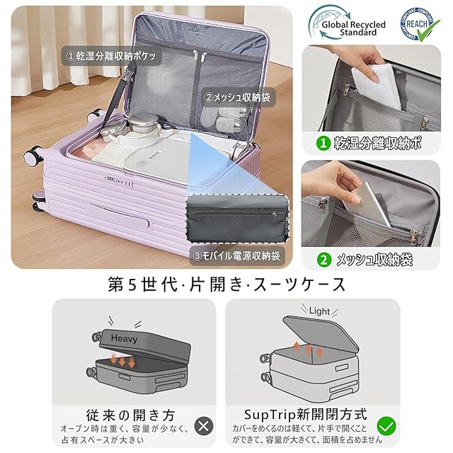 【第5世代·片開き·スーツケース】片面開きなので、狭い場所でも完全に開かずに荷物を出し入れでき、占有スペースが50%削減され、片手でも簡単に開くことができます。ファスナーを1周ひねるだけで容量が20%アップし、より多くの収納スペースを提供します。旅先での買い物など荷物が増えても安心ですし、急に増えた荷物にも気軽に対応できます。注意:拡張後は機内に持ち込めません。