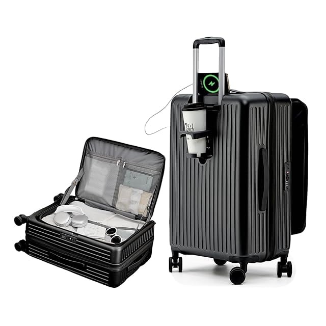 [SupTrip] スーツケース キャリーケース 多機能 片開き 拡張機能付き 機内持ち込み キャリーバッグ フロントオープン USBポート付き カップホルダー付き 隠しフック機能 超軽量 耐衝撃 静音 360度回転 大容量 TSAロック搭載 旅行 ビジネス 出張 (ブラック, M (4~6泊/65L))